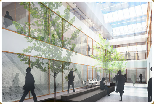 The building offers space for a lecture hall with 500 seats, a library, a restaurant and places to study and work.