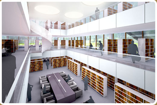 The building offers space for a lecture hall with 500 seats, a library, a restaurant and places to study and work.